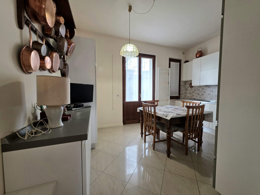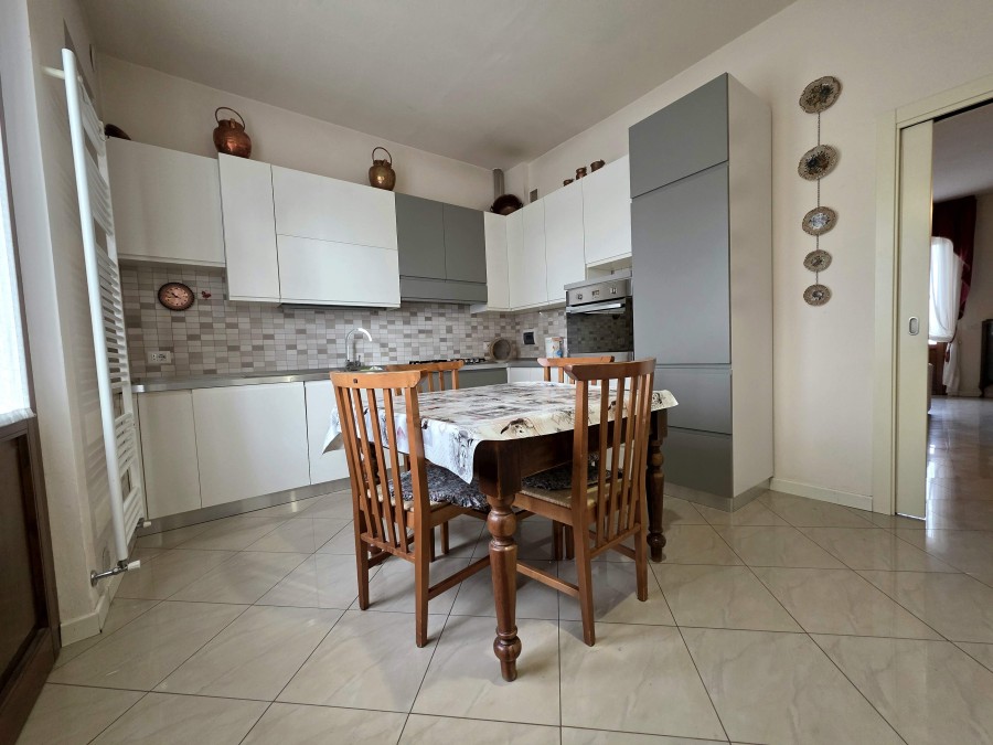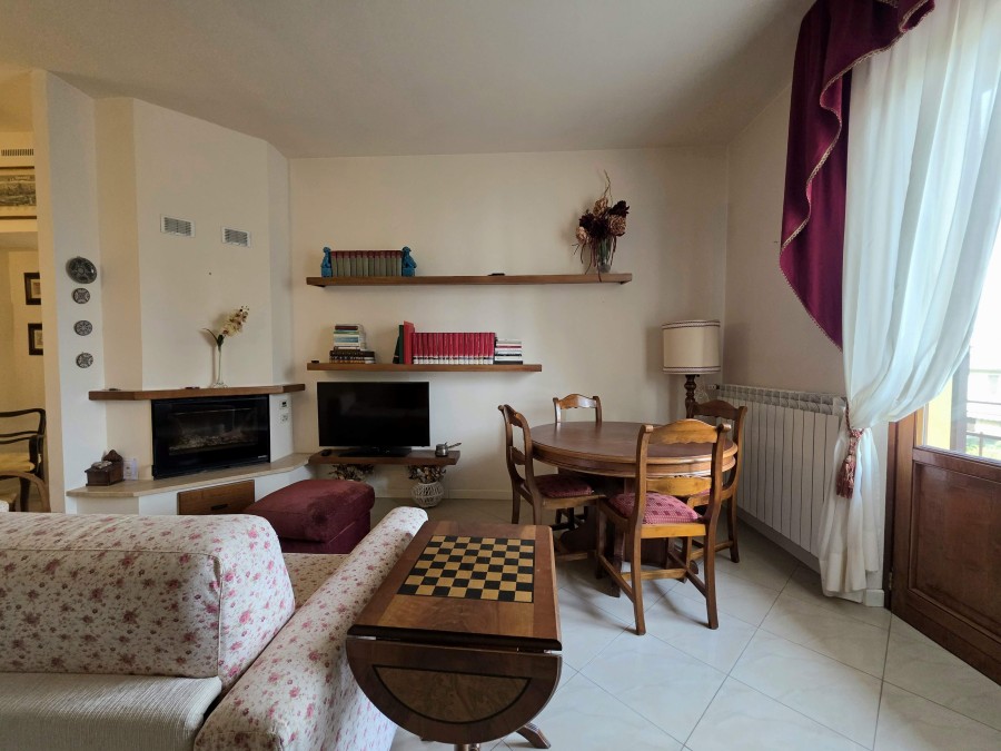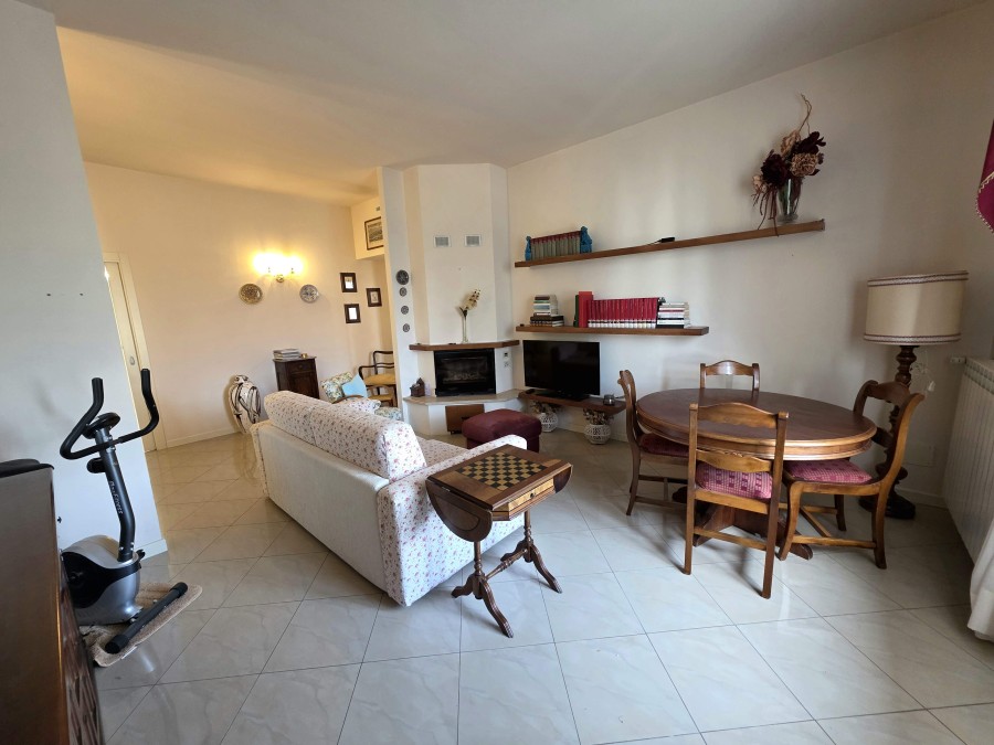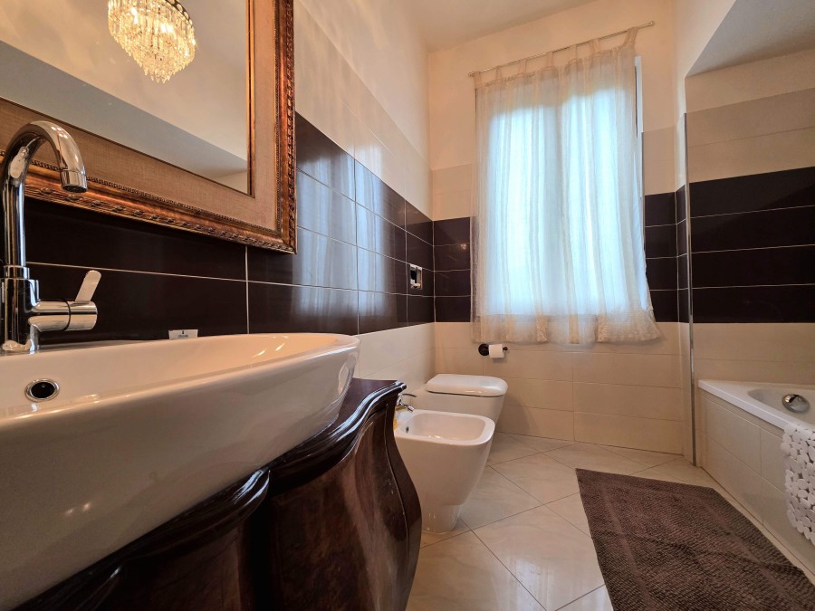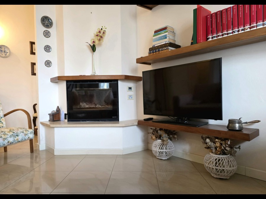 L’ingresso introduce a un ampio soggiorno, raffinato e accogliente, impreziosito da un camino dotato di sistema di diffusione meccanica del calore in tutta l’abitazione e accesso diretto al balcone. La cucina abitabile, anch’essa con balcone, è un ambiente pensato per chi ama vivere la casa con gusto e convivialità.
